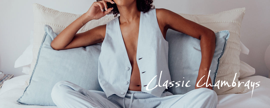 the classic answer to denim in summer, our pure indian cotton chambray in faded blue. perfectly tailored separates to wear as a set or team with your own wardrobe favourites. Our chambray waistcoat is so beautifully constructed and fully lined in a vintage foundling hand printed floral cotton voile. Carefully and ethically made as they should be.